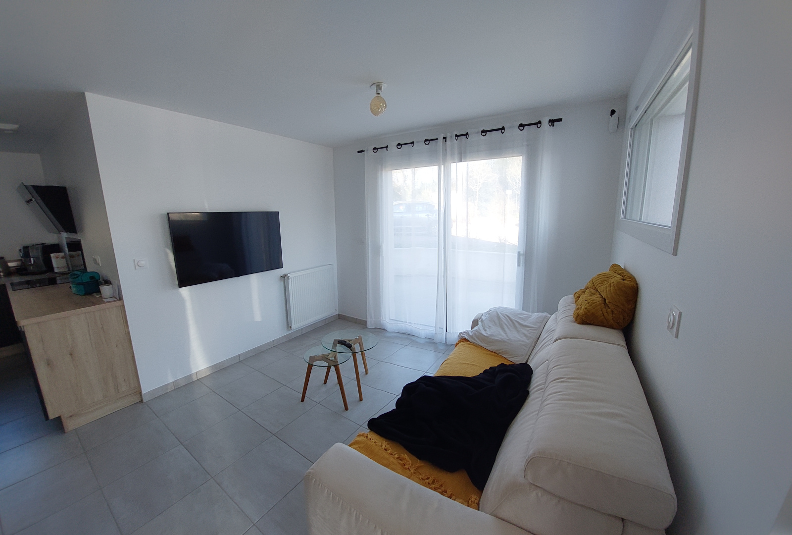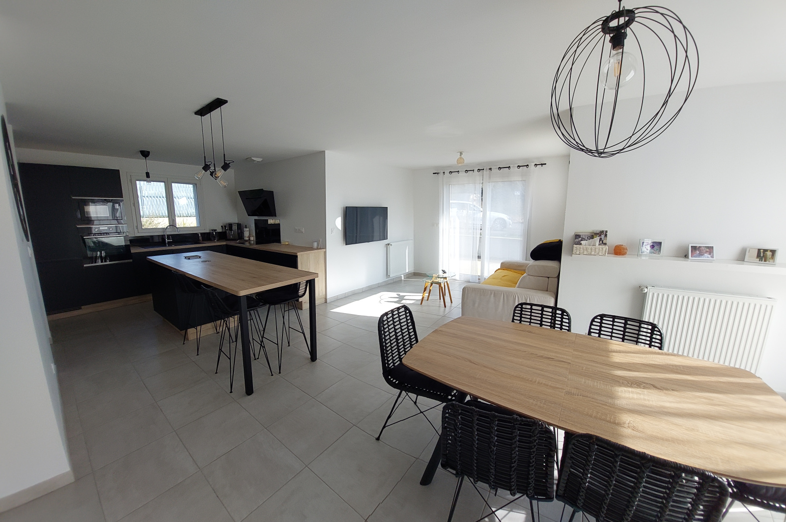 Entrée sur salon/séjour lumineux avec cuisine ouverte aménagée et équipée, wc, suite parentale avec dressing et salle d'eau, buanderie et garage attenant.