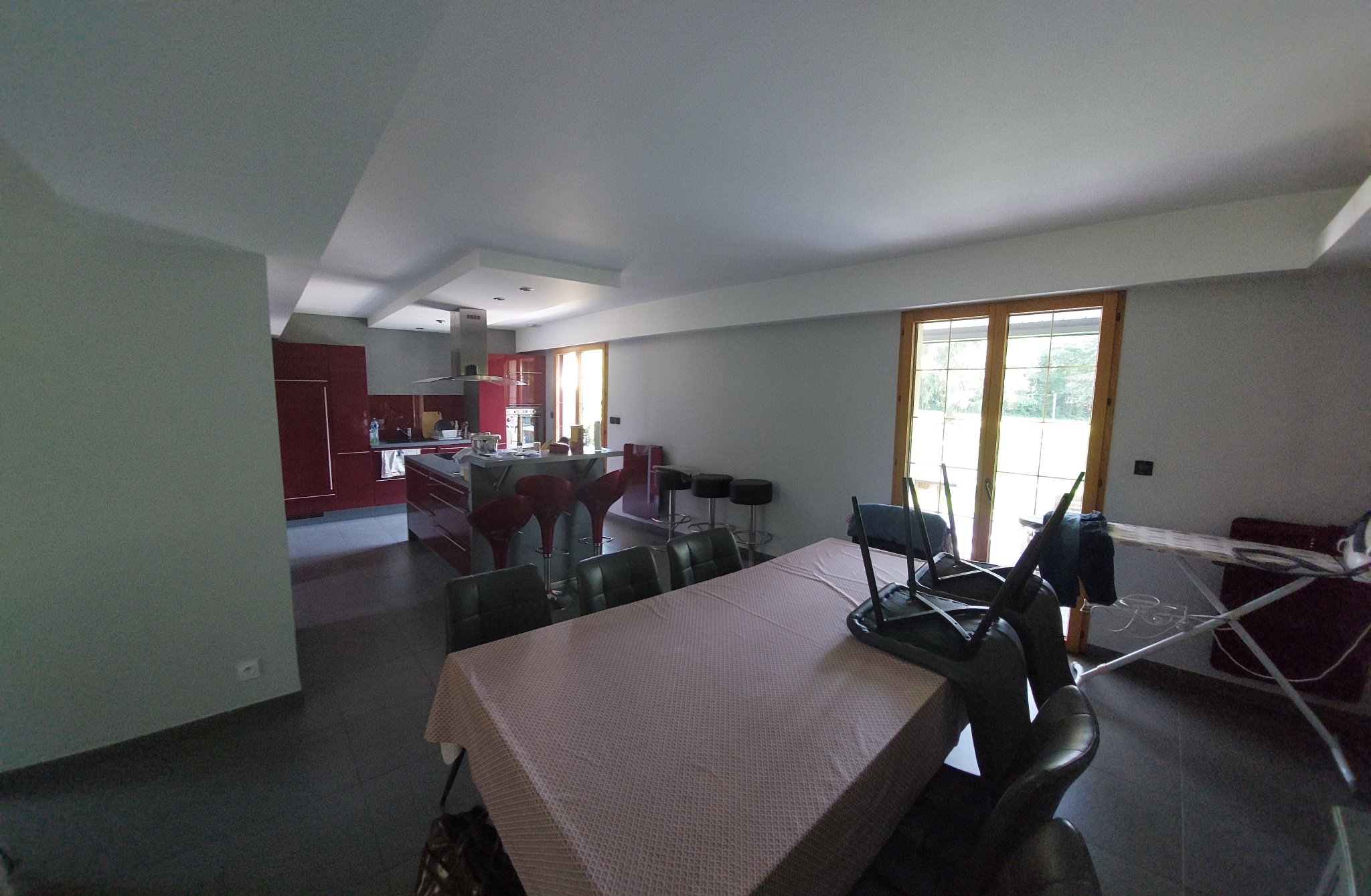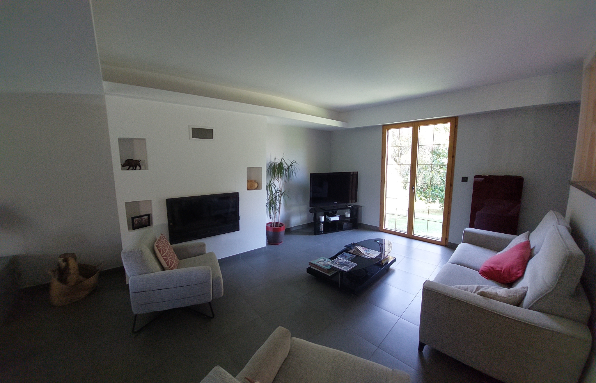 Entrée sur salon/séjour lumineux d'environ 45m² avec cheminée, cuisine ouverte aménagée et équipée, une chambre avec rangement, une salle de bain, un wc